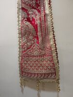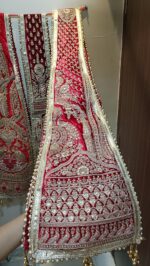 Presenting the bridal patta chundadi by “KUMKUM IT’S HERITAGE” – a classic blend of traditional artistry and contemporary style. This exquisite chundadi, also known as dupatta, is designed to bring a touch of elegance and cultural richness to your wedding and other occasions ensemble.