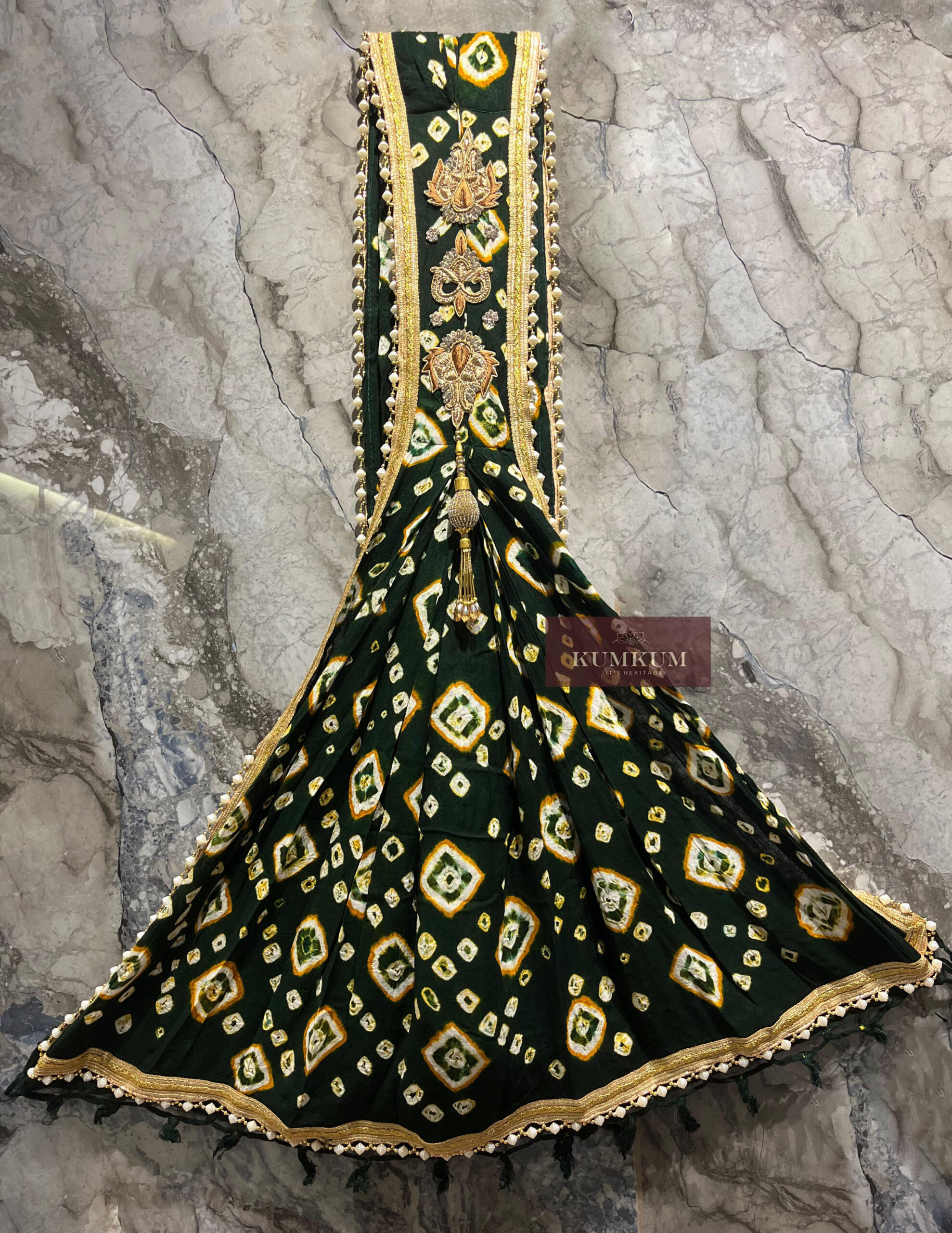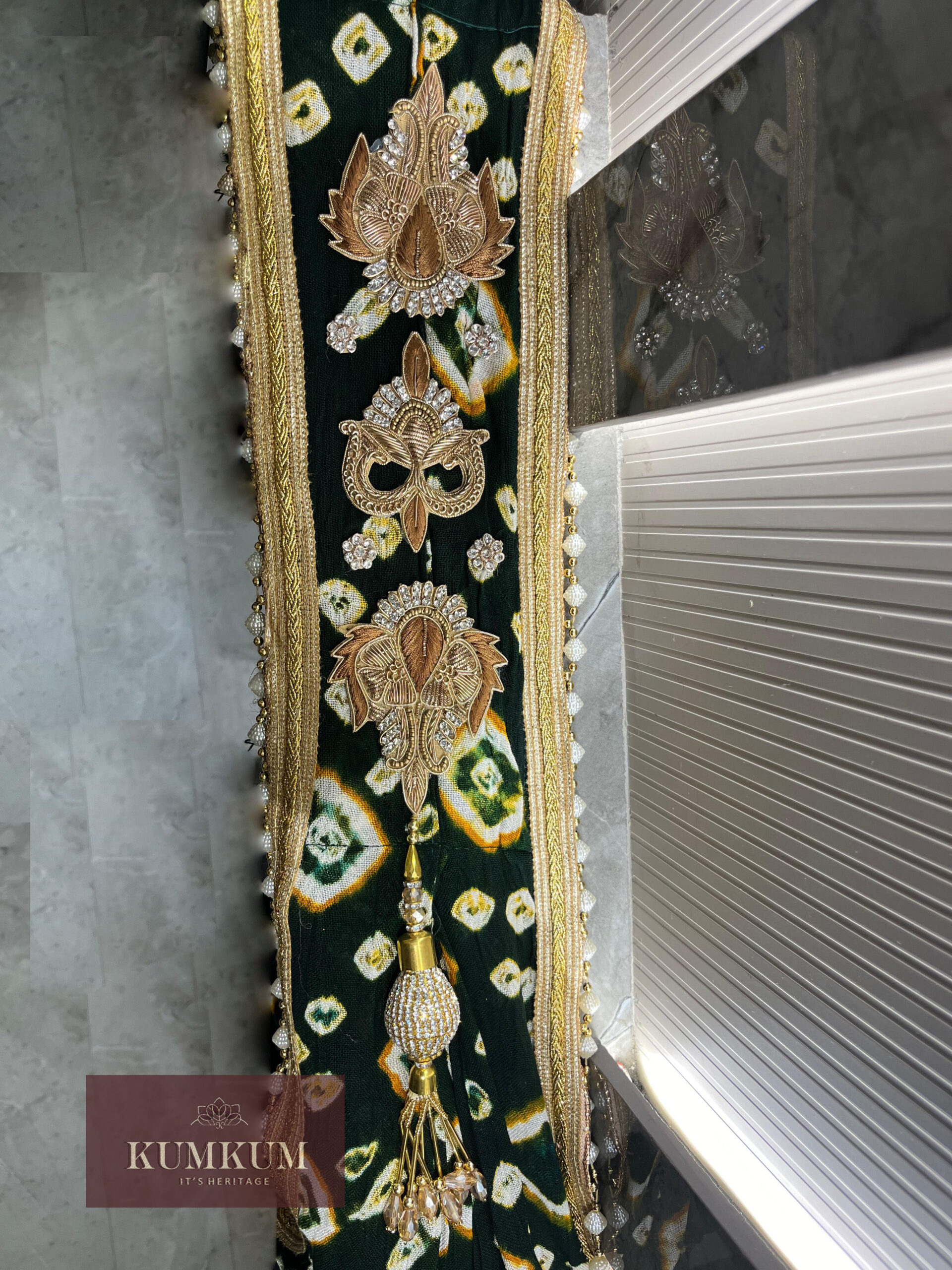 Presenting the Bandhani Chundadi by “KUMKUM IT’S HERITAGE” – a classic blend of traditional artistry and contemporary style. This exquisite chundadi, also known as dupatta, is designed to bring a touch of elegance and cultural richness to your wedding ensemble.