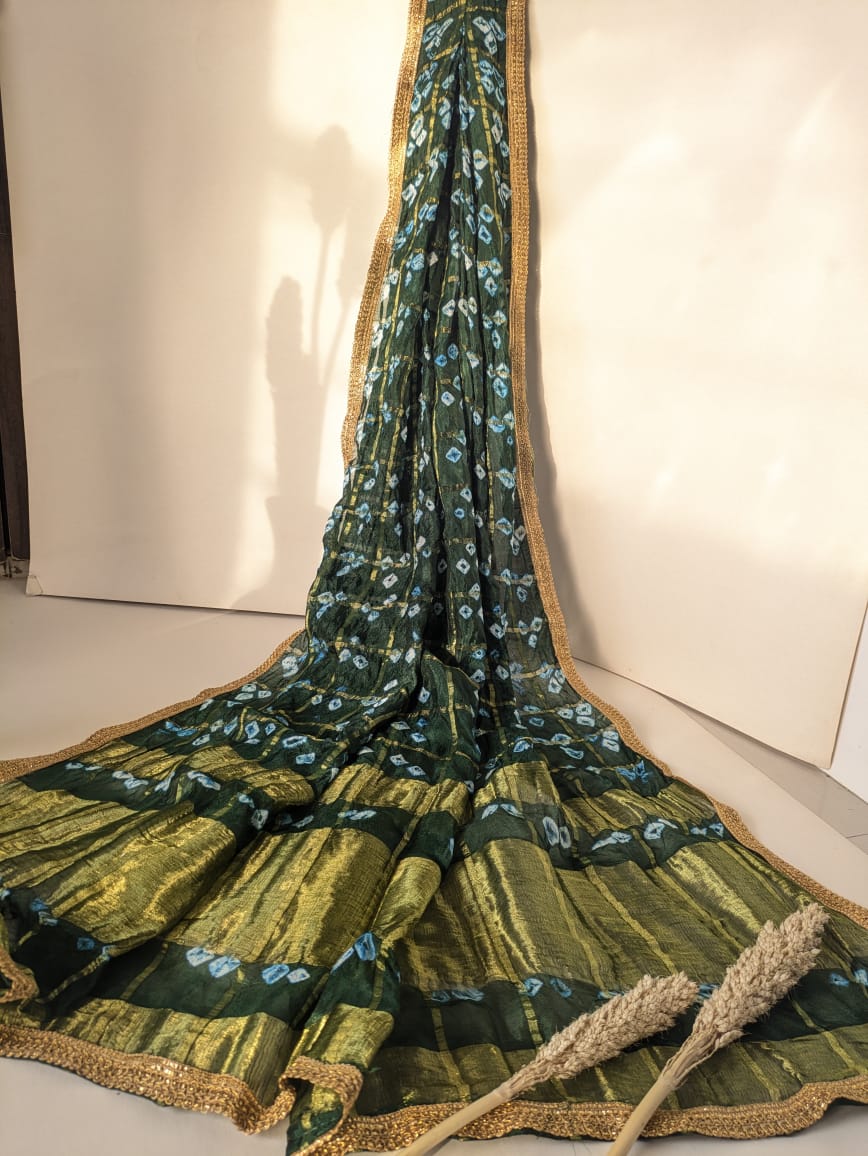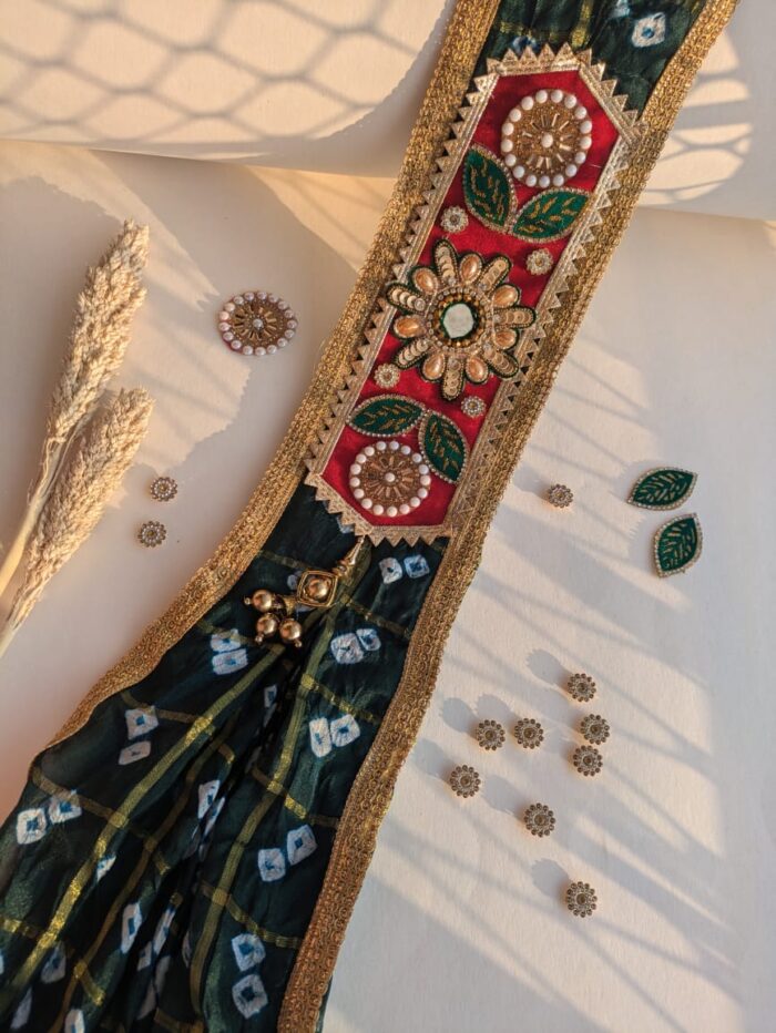 • Elegant Aesthetic:Ā Enhances the overall aesthetic of your wedding ensemble with its luxurious texture and intricate Bandhani patterns.